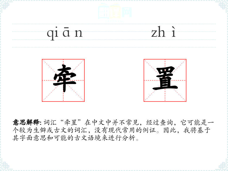 词汇“牵置”在中文中并不常见,经过查询,它可能是一个较为生僻或古文的词汇,没有现代常用的例证。因此,我将基于其字面意思和可能的古文语境来进行分析。