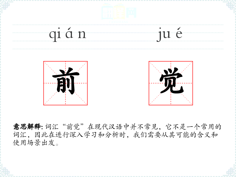 词汇“前觉”在现代汉语中并不常见,它不是一个常用的词汇,因此在进行深入学*和分析时,我们需要从其可能的含义和使用场景出发。