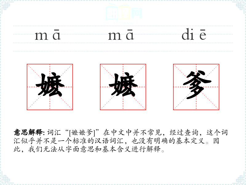 词汇“[嬷嬷爹]”在中文中并不常见,经过查询,这个词汇似乎并不是一个标准的汉语词汇,也没有明确的基本定义。因此,我们无法从字面意思和基本含义进行解释。