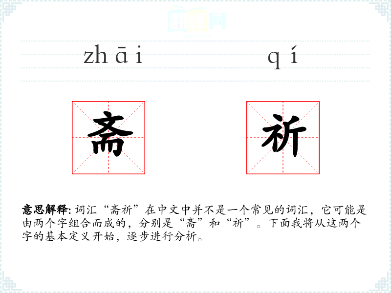 词汇“斋祈”在中文中并不是一个常见的词汇,它可能是由两个字组合而成的,分别是“斋”和“祈”。下面我将从这两个字的基本定义开始,逐步进行分析。