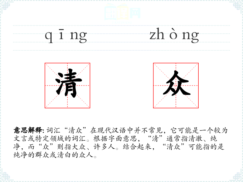 词汇“清众”在现代汉语中并不常见,它可能是一个较为文言或特定领域的词汇。根据字面意思,“清”通常指清澈、纯净,而“众”则指大众、许多人。结合起来,“清众”可能指的是纯净的群众或清白的众人。