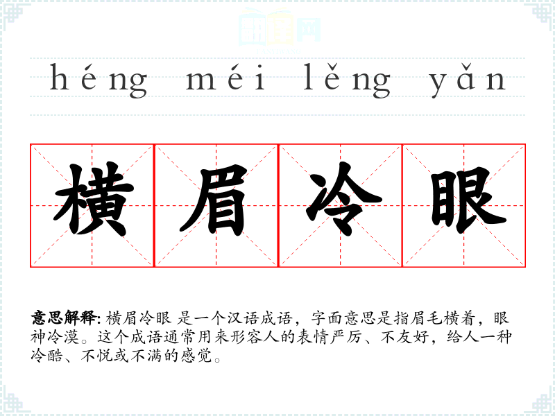 横眉冷眼 是一个汉语成语,字面意思是指眉毛横着,眼神冷漠。这个成语通常用来形容人的表情严厉、不友好,给人一种冷酷、不悦或不满的感觉。