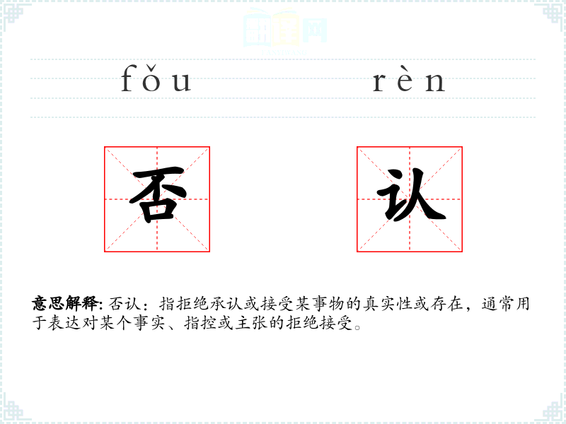 否认:指拒绝承认或接受某事物的真实性或存在,通常用于表达对某个事实、指控或主张的拒绝接受。