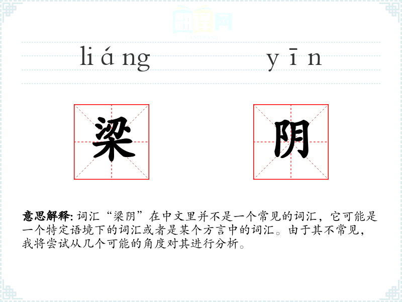 词汇“梁阴”在中文里并不是一个常见的词汇,它可能是一个特定语境下的词汇或者是某个方言中的词汇。由于其不常见,我将尝试从几个可能的角度对其进行分析。
