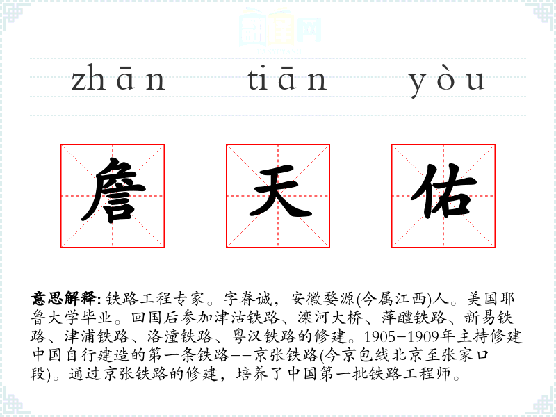 1.铁路工程专家。字眷诚,安徽婺源(今属江西)人。美国耶鲁大学毕业。回国后参加津沽铁路、滦河大桥、萍醴铁路、新易铁路、津浦铁路、洛潼铁路、粤汉铁路的修建。1905-1909年主持修建中国自行建造的第一条铁路--京张铁路(今京包线北京至张家口段)。通过京张铁路的修建,培养了中国第一批铁路工程师。
