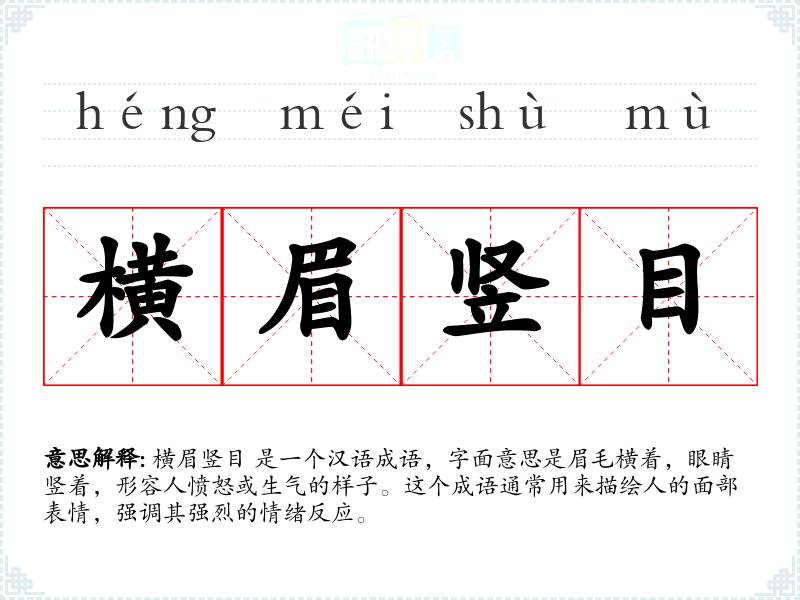横眉竖目 是一个汉语成语,字面意思是眉毛横着,眼睛竖着,形容人愤怒或生气的样子。这个成语通常用来描绘人的面部表情,强调其强烈的情绪反应。