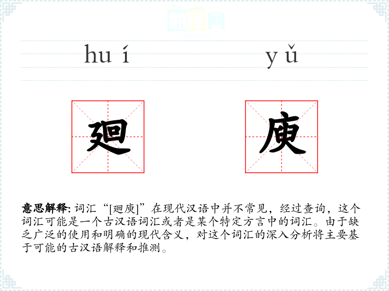 词汇“[廻庾]”在现代汉语中并不常见,经过查询,这个词汇可能是一个古汉语词汇或者是某个特定方言中的词汇。由于缺乏广泛的使用和明确的现代含义,对这个词汇的深入分析将主要基于可能的古汉语解释和推测。