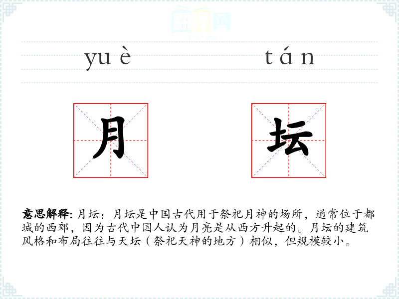 - 反义词:天坛(与祭祀天神相关的场所,与月坛相对)