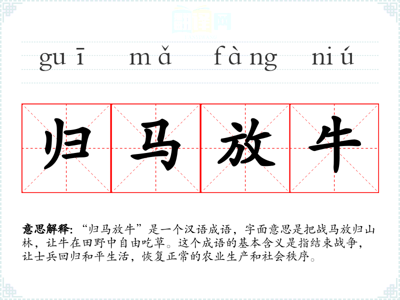 “归马放牛”是一个汉语成语,字面意思是把战马放归山林,让牛在田野中自由吃草。这个成语的基本含义是指结束战争,让士兵回归和平生活,恢复正常的农业生产和社会秩序。