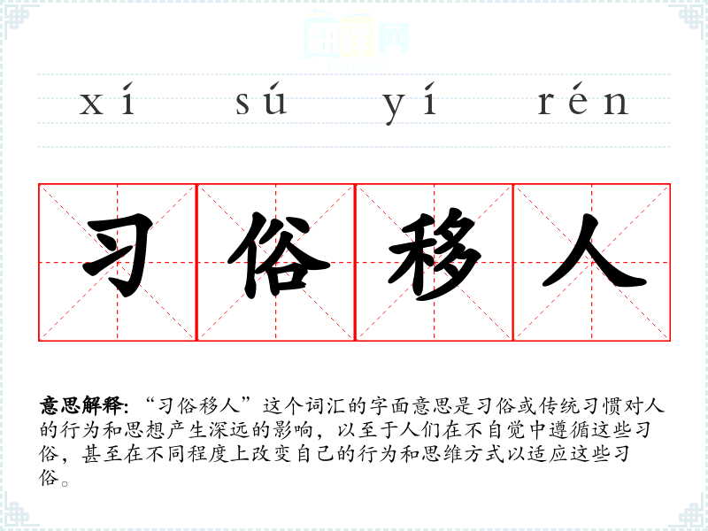 “习俗移人”这个词汇的字面意思是习俗或传统习惯对人的行为和思想产生深远的影响,以至于人们在不自觉中遵循这些习俗,甚至在不同程度上改变自己的行为和思维方式以适应这些习俗。