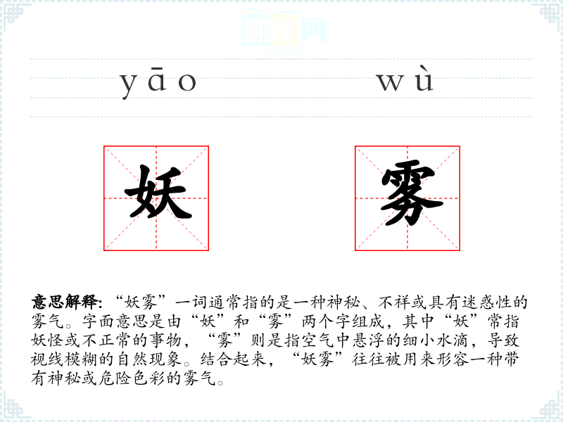 - 反义词:清雾、*雾。这些词通常描述的是自然、无害的雾气,没有“妖雾”中的负面或神秘色彩。