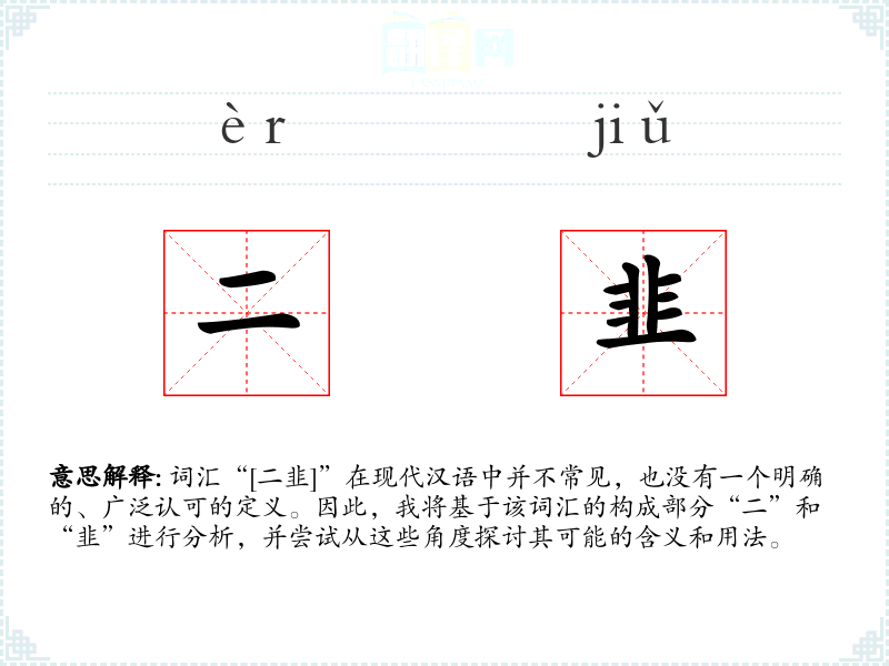 词汇“[二韭]”在现代汉语中并不常见,也没有一个明确的、广泛认可的定义。因此,我将基于该词汇的构成部分“二”和“韭”进行分析,并尝试从这些角度探讨其可能的含义和用法。