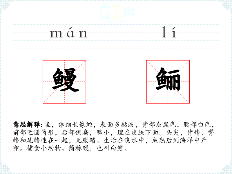 1.鱼,体细长像蛇,表面多黏液,背部灰黑色,腹部白色,前部近圆筒形,后部侧扁,鳞小,埋在皮肤下面。头尖,背鳍、臀鳍和尾鳍连在一起,无腹鳍。生活在淡水中,成熟后到海洋中产卵。捕食小动物。简称鳗,也叫白鳝。