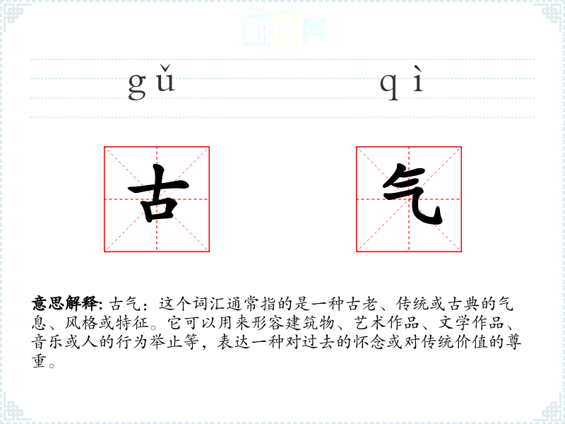 - 口语:在日常对话中,人们可能会用“古气”来形容某人的穿着或行为显得老派或传统。