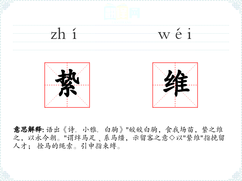 语出《诗.小雅.白驹》"皎皎白驹,食我场苗,絷之维之,以永今朝。"谓绊马足﹑系马缰,示留客之意◇以"絷维"指挽留人才; 拴马的绳索。引申指束缚。