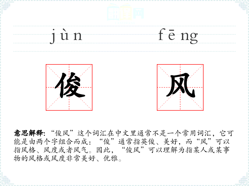 “俊风”这个词汇在中文里通常不是一个常用词汇,它可能是由两个字组合而成:“俊”通常指英俊、美好,而“风”可以指风格、风度或者风气。因此,“俊风”可以理解为指某人或某事物的风格或风度非常美好、优雅。