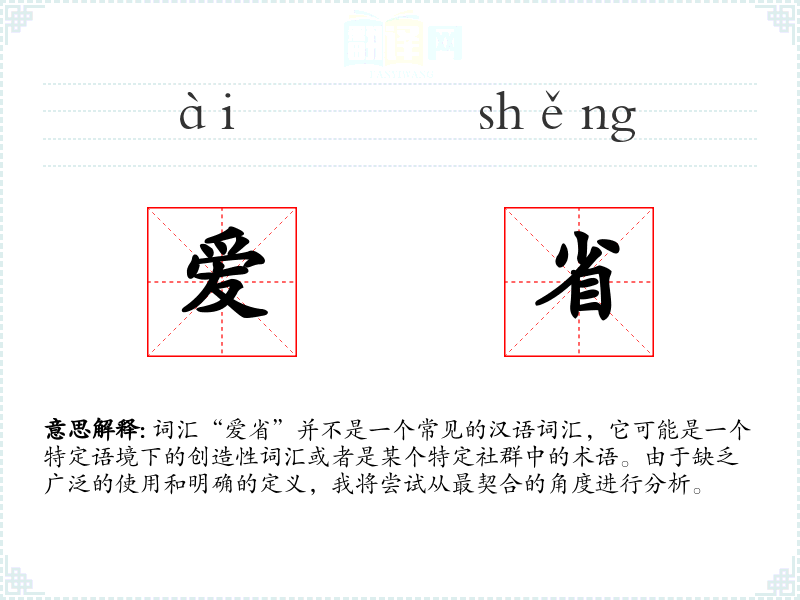 由于“爱省”不是一个标准词汇,我们可以推测它的字面意思可能是“热爱节约”或“热爱省俭”。这里的“爱”表示强烈的情感或倾向,而“省”则可能指节约、省俭或某个具体的省份。