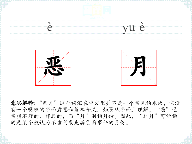 “恶月”这个词汇在中文里并不是一个常见的术语,它没有一个明确的字面意思和基本含义。如果从字面上理解,“恶”通常指不好的、邪恶的,而“月”则指月份。因此,“恶月”可能指的是某个被认为不吉利或充满负面**的月份。