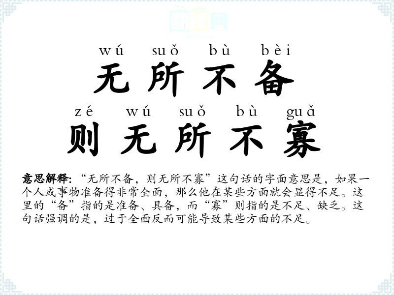 “无所不备,则无所不寡”这句话的字面意思是,如果一个人或事物准备得非常全面,那么他在某些方面就会显得不足。这里的“备”指的是准备、具备,而“寡”则指的是不足、缺乏。这句话强调的是,过于全面反而可能导致某些方面的不足。