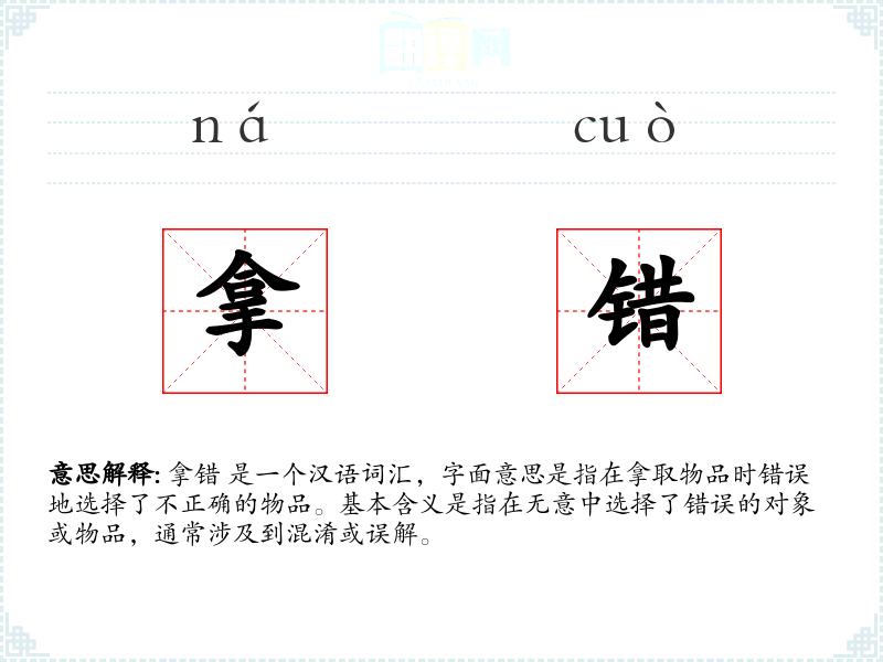 拿错 是一个汉语词汇,字面意思是指在拿取物品时错误地选择了不正确的物品。基本含义是指在无意中选择了错误的对象或物品,通常涉及到混淆或误解。