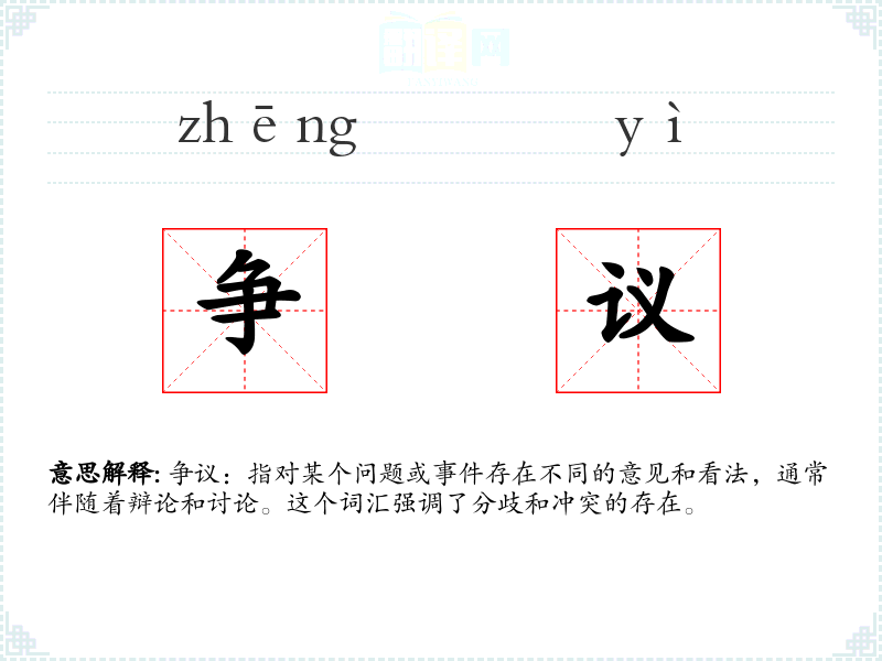 争议:指对某个问题或**存在不同的意见和看法,通常伴随着辩论和讨论。这个词汇强调了分歧和冲突的存在。