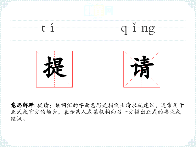 提请:该词汇的字面意思是指提出请求或建议,通常用于正式或官方的场合,表示某人或某机构向另一方提出正式的要求或建议。