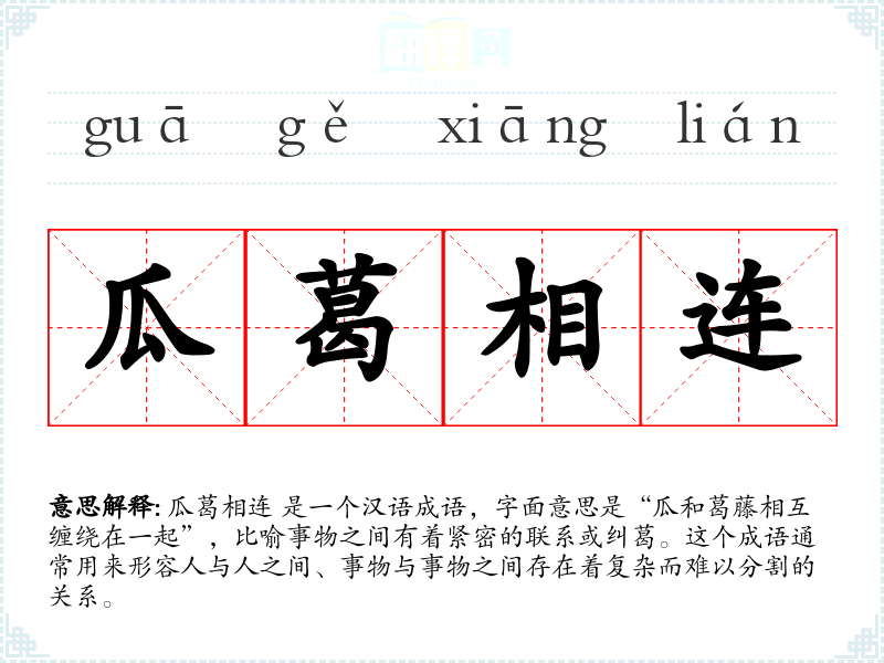 瓜葛相连 是一个汉语成语,字面意思是“瓜和葛藤相互缠绕在一起”,比喻事物之间有着紧密的联系或纠葛。这个成语通常用来形容人与人之间、事物与事物之间存在着复杂而难以分割的关系。