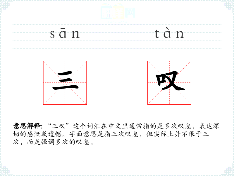 “三叹”这个词汇在中文里通常指的是多次叹息,表达深切的感慨或遗憾。字面意思是指三次叹息,但实际上并不限于三次,而是强调多次的叹息。