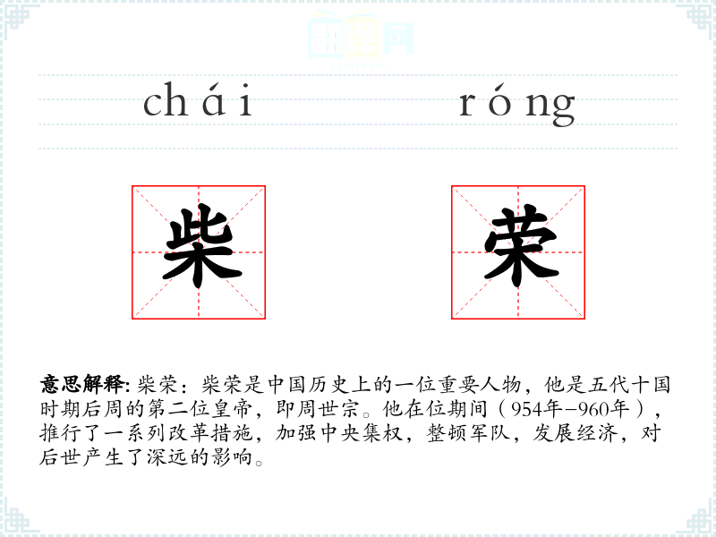 在历史学术语境中,“柴荣”通常指代这位后周及其政治成就。在文学作品中,他可能被描绘为一个英明的君主或改革者。在口语中,提及“柴荣”可能是在讨论历史或人物时。
