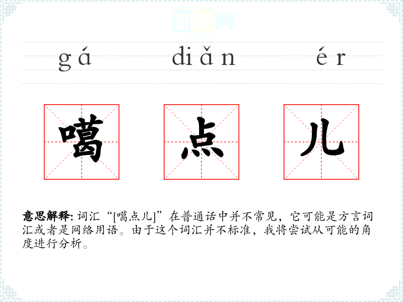 词汇“[噶点儿]”在普通话中并不常见,它可能是方言词汇或者是网络用语。由于这个词汇并不标准,我将尝试从可能的角度进行分析。