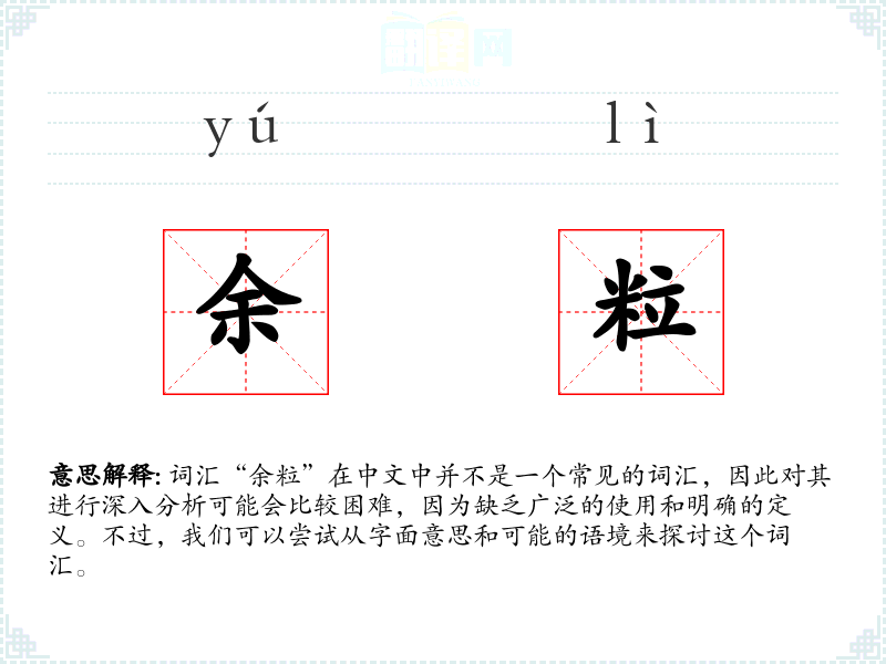尽管“余粒”不是一个常用词汇,但它反映了中文中对剩余和颗粒概念的表达。在语言学习和表达中,了解和掌握这样的词汇可以帮助我们更准确地描述和理解特定语境下的细节。