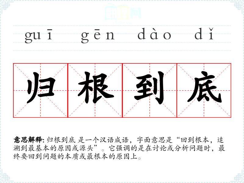 归根到底 是一个汉语成语,字面意思是“回到根本,追溯到最基本的原因或源头”。它强调的是在讨论或分析问题时,最终要回到问题的本质或最根本的原因上。