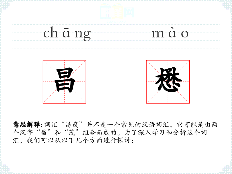 词汇“昌茂”并不是一个常见的汉语词汇,它可能是由两个汉字“昌”和“茂”组合而成的。为了深入学*和分析这个词汇,我们可以从以下几个方面进行探讨: