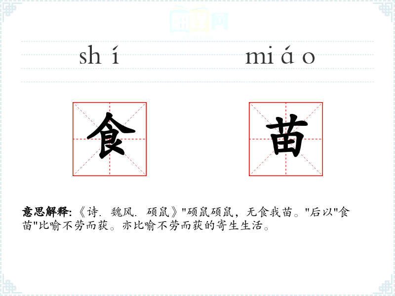 《诗.魏风.硕鼠》"硕鼠硕鼠,无食我苗。"后以"食苗"比喻