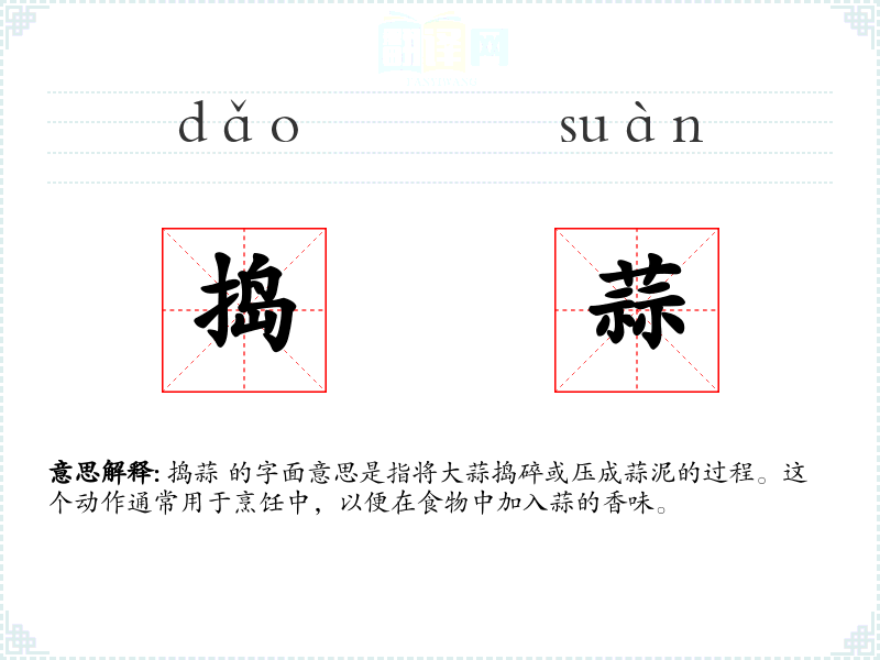 捣蒜 的字面意思是指将大蒜捣碎或压成蒜泥的过程。这个动作通常用于烹饪中,以便在食物中加入蒜的香味。
