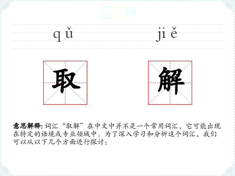 词汇“取解”在中文中并不是一个常用词汇,它可能出现在特定的语境或专业领域中。为了深入学*和分析这个词汇,我们可以从以下几个方面进行探讨:
