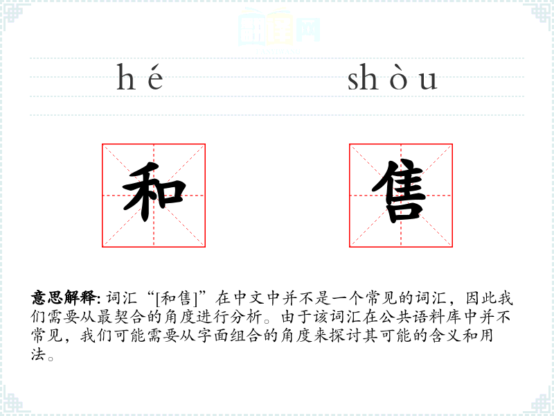 词汇“[和售]”在中文中并不是一个常见的词汇,因此我们需要从最契合的角度进行分析。由于该词汇在公共语料库中并不常见,我们可能需要从字面组合的角度来探讨其可能的含义和用法。