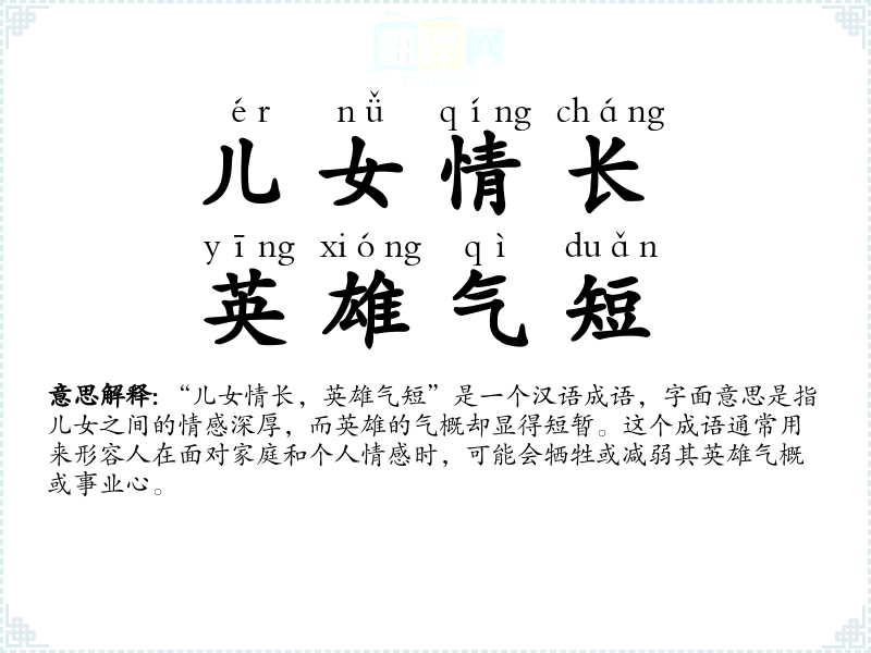 “儿女情长,英雄气短”是一个汉语成语,字面意思是指儿女之间的情感深厚,而英雄的气概却显得短暂。这个成语通常用来形容人在面对家庭和个人情感时,可能会牺牲或减弱其英雄气概或事业心。