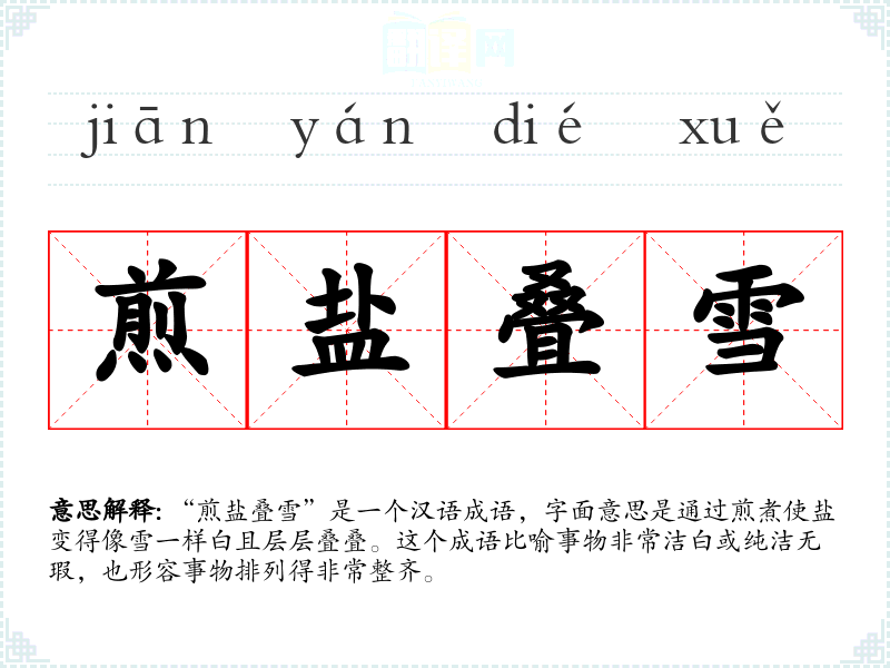 “煎盐叠雪”是一个汉语成语,字面意思是通过煎煮使盐变得像雪一样白且层层叠叠。这个成语比喻事物非常洁白或纯洁无瑕,也形容事物排列得非常整齐。