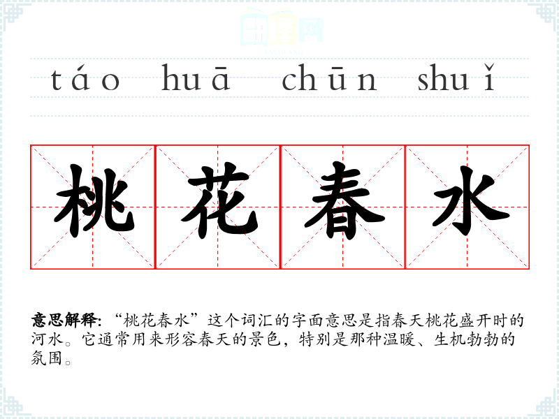 “桃花春水”这个词汇的字面意思是指春天桃花盛开时的河水。它通常用来形容春天的景色,特别是那种温暖、生机勃勃的氛围。