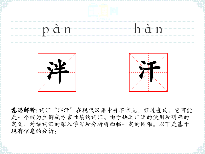 词汇“泮汗”在现代汉语中并不常见,经过查询,它可能是一个较为生僻或方言性质的词汇。由于缺乏广泛的使用和明确的定义,对该词汇的深入学习和分析将面临一定的困难。以下是基于现有信息的分析: