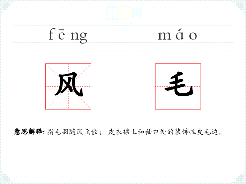 指毛羽随风飞散; 皮衣襟上和袖口处的装饰性皮毛边。