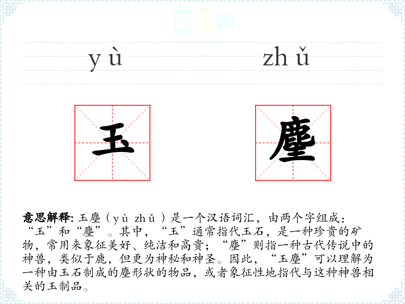 玉麈(yù zhǔ)是一个汉语词汇,由两个字组成:“玉”和“麈”。其中,“玉”通常指代玉石,是一种珍贵的矿物,常用来象征美好、纯洁和高贵;“麈”则指一种古代传说中的神兽,类似于鹿,但更为神秘和神圣。因此,“玉麈”可以理解为一种由玉石制成的麈形状的物品,或者象征性地指代与这种神兽相关的玉制品。