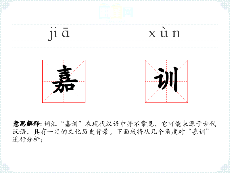 “嘉训”由两个汉字组成:“嘉”意为好、优秀、赞美,“训”意为教导、训诫。因此,“嘉训”字面意思是指好的教导或优秀的训诫。