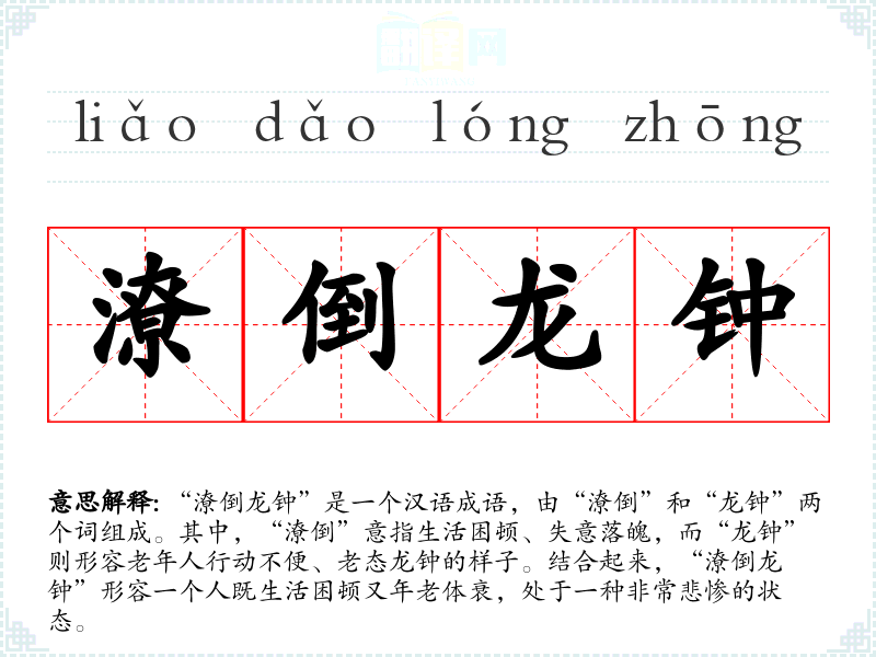“潦倒”一词源于古代汉语,最初指水流不畅,后引申为人的生活或事业不顺。“龙钟”则源自对老年人行动不便的形容,如钟摆摇摆不定,形容老年人行动迟缓。
