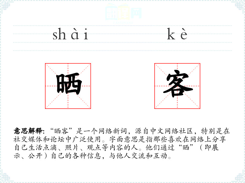 “晒客”这个词反映了现代社会中人们通过网络分享和交流的新趋势。它不仅是一个描述性的词汇,也反映了我们对于社交、表达和连接的需求。在学习语言和理解文化时,了解这样的新词汇及其背后的社会现象是非常重要的。