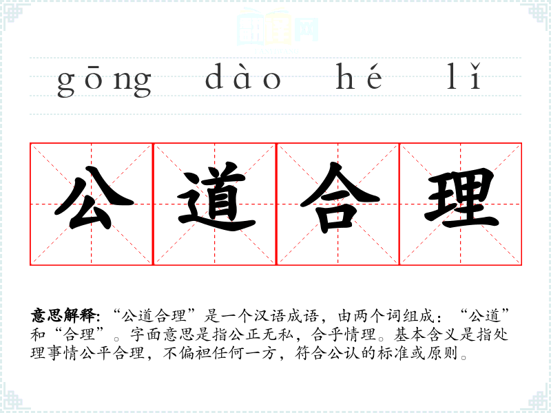 “公道”一词源于古代汉语,原指公共的道路,后引申为公正无私的意思。“合理”则指合乎道理或逻辑。这两个词组合在一起,形成了“公道合理”这个成语,强调的是公正和合理的结合。