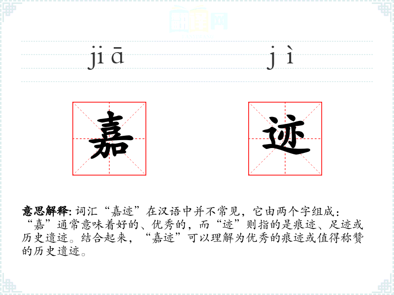 “嘉迹”字面意思是指好的、值得赞扬的痕迹或历史遗迹。它强调了这些痕迹或遗迹的正面价值和重要性。