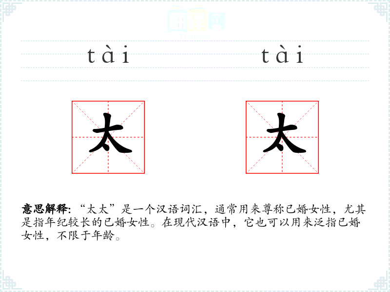 “太太”是一个汉语词汇,通常用来尊称已婚女性,尤其是指年纪较长的已婚女性。在现代汉语中,它也可以用来泛指已婚女性,不限于年龄。