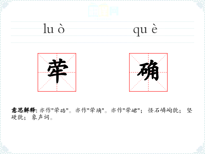 亦作"荦硞"。亦作"荦埆"。亦作"荦峮"; 怪石嶙峋貌; 坚硬貌; 象声词。